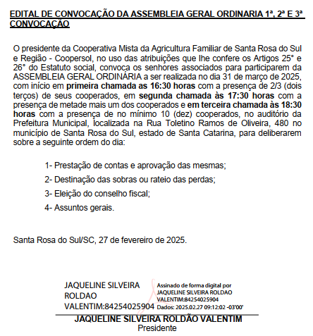 Edital: Coopersol de Santa Rosa convoca associados para Assembleia Jarbas Vieira10 de mar. de 20250 min de leituraEDITAL DE CONVOCAÇÃO.pdfFazer download de PDF • 87KB